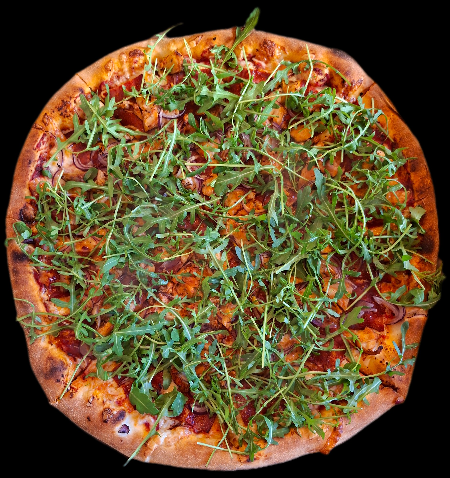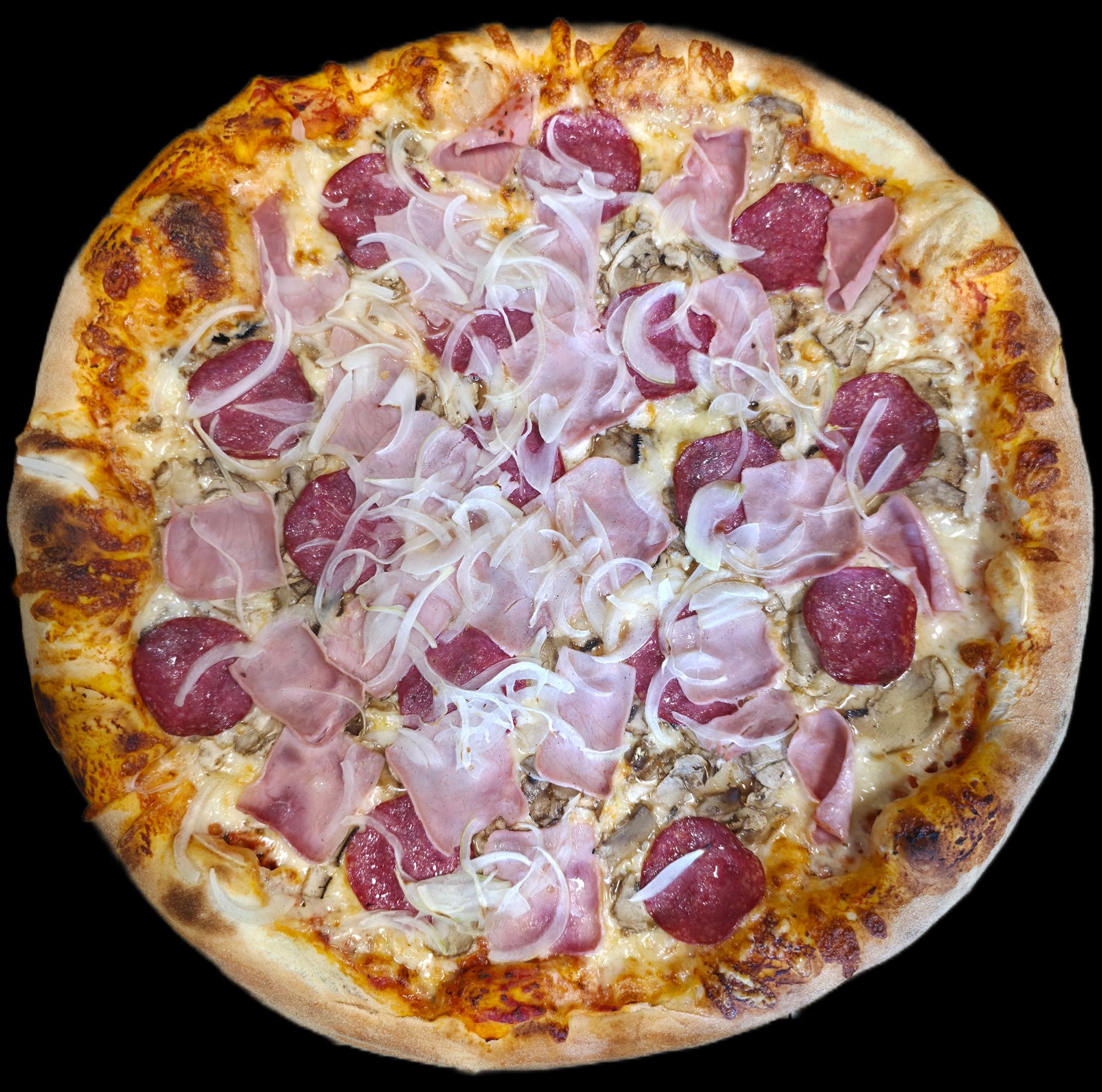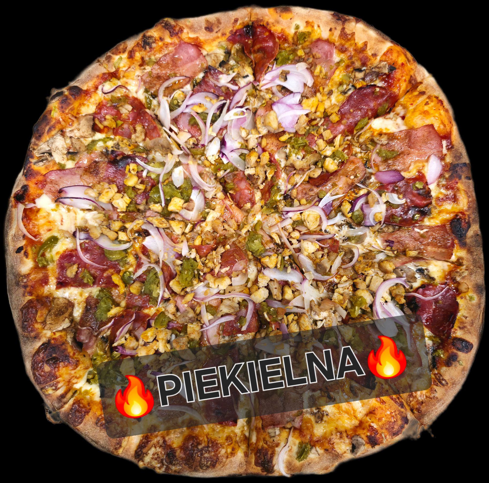 Sos, ser, pieczony kurczak w autorskiej marynacie, chorizo, salami, boczek, kabanos, pomidorki koktajlowe, cebula