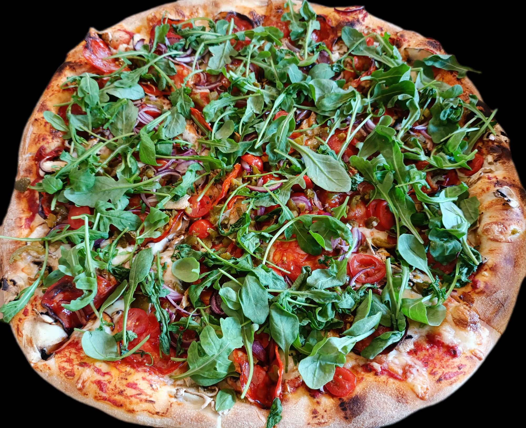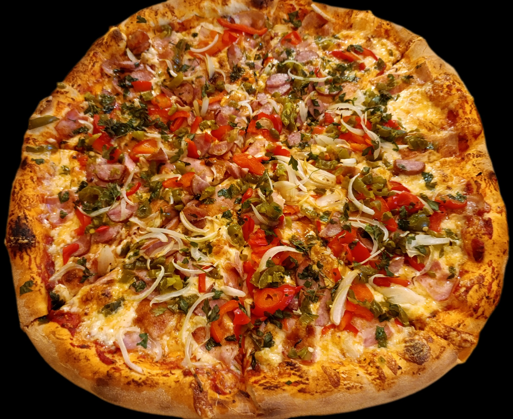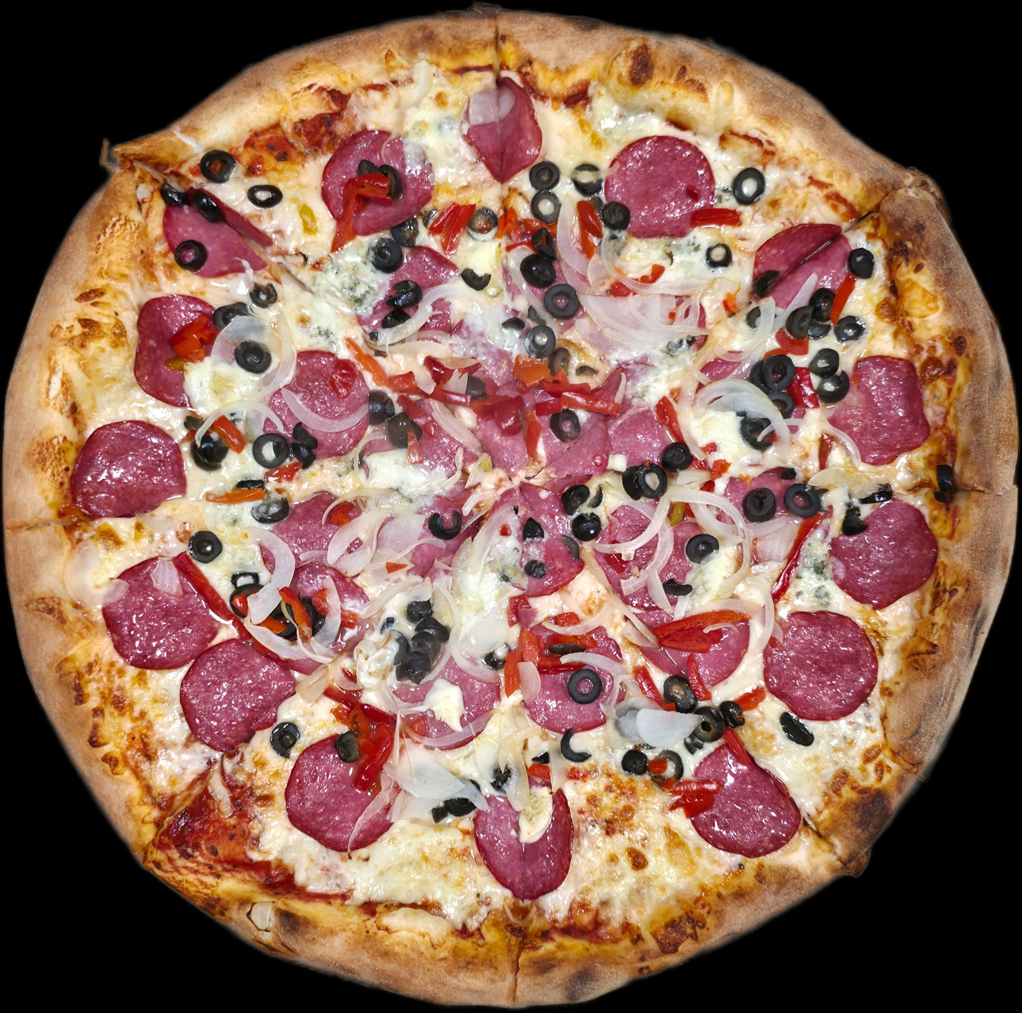 Sos, ser, pieczony kurczak w autorskiej marynacie, chorizo, salami, boczek, kabanos, pomidorki koktajlowe, cebula